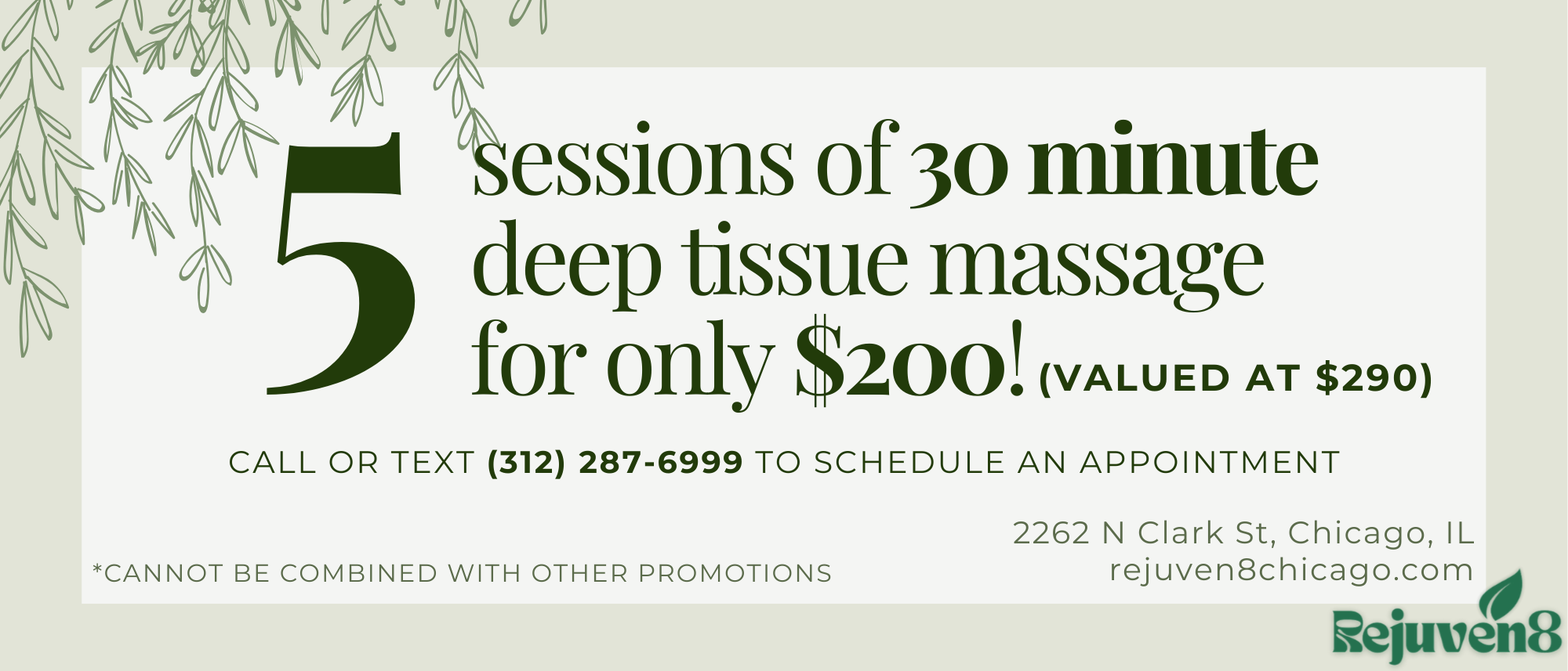 SPECIALS SPECIALS SPECIALS BUNDLE SAVINGS ALERT!$290 VALUE FOR ONLY $200!Get 5 sessions of 30 minute deep tissue massage when you pay $200!